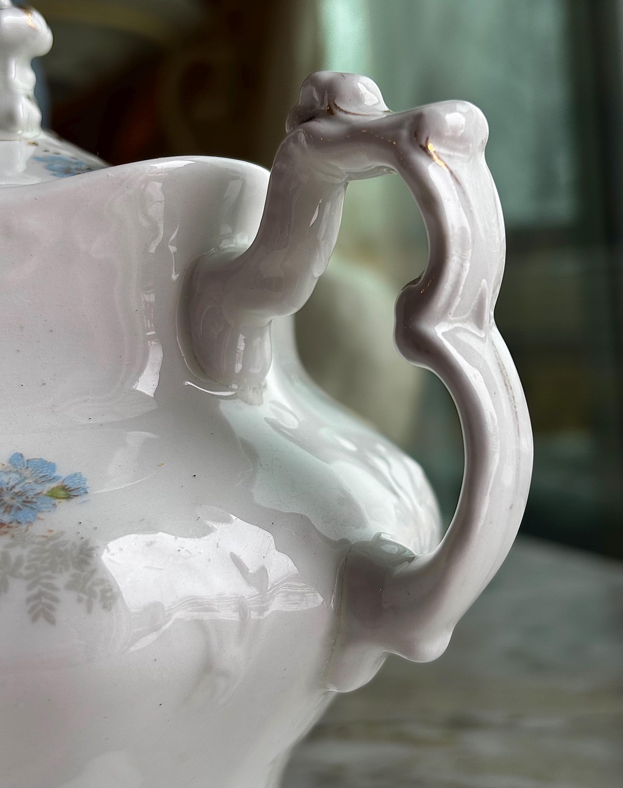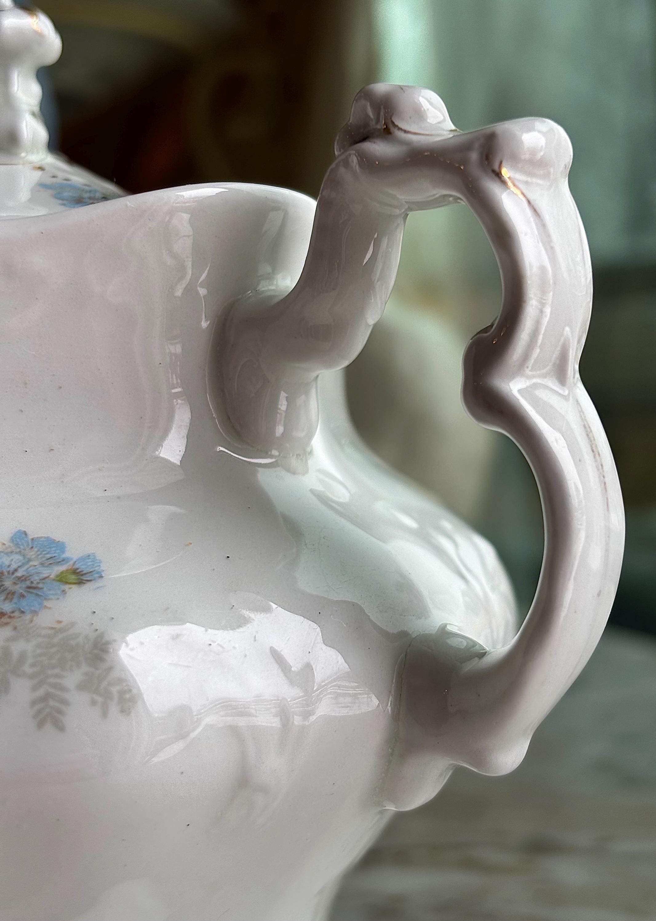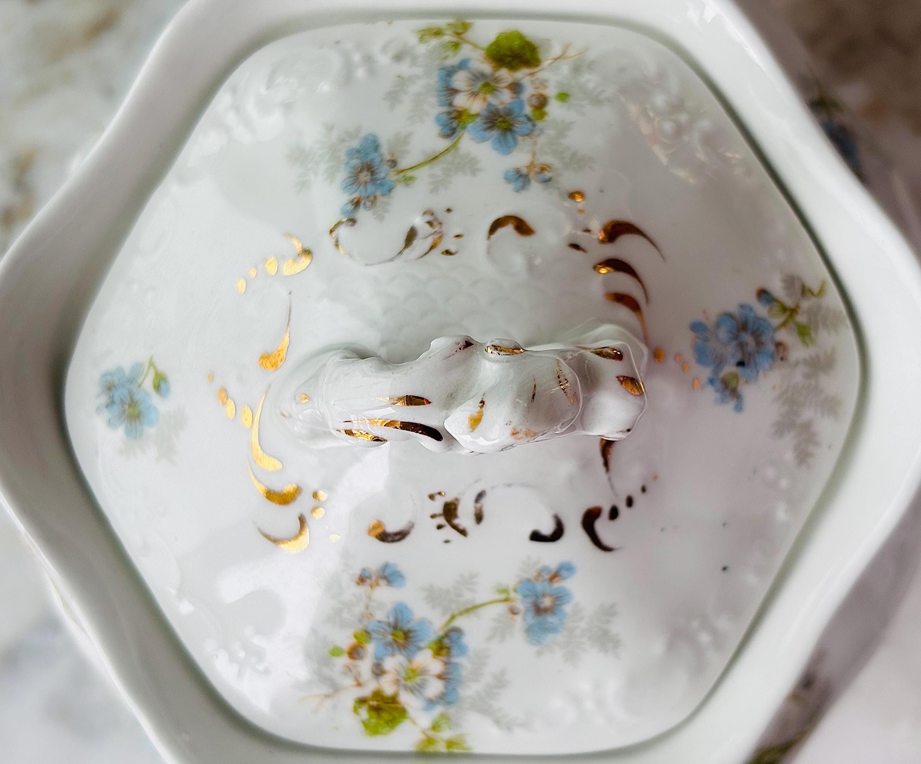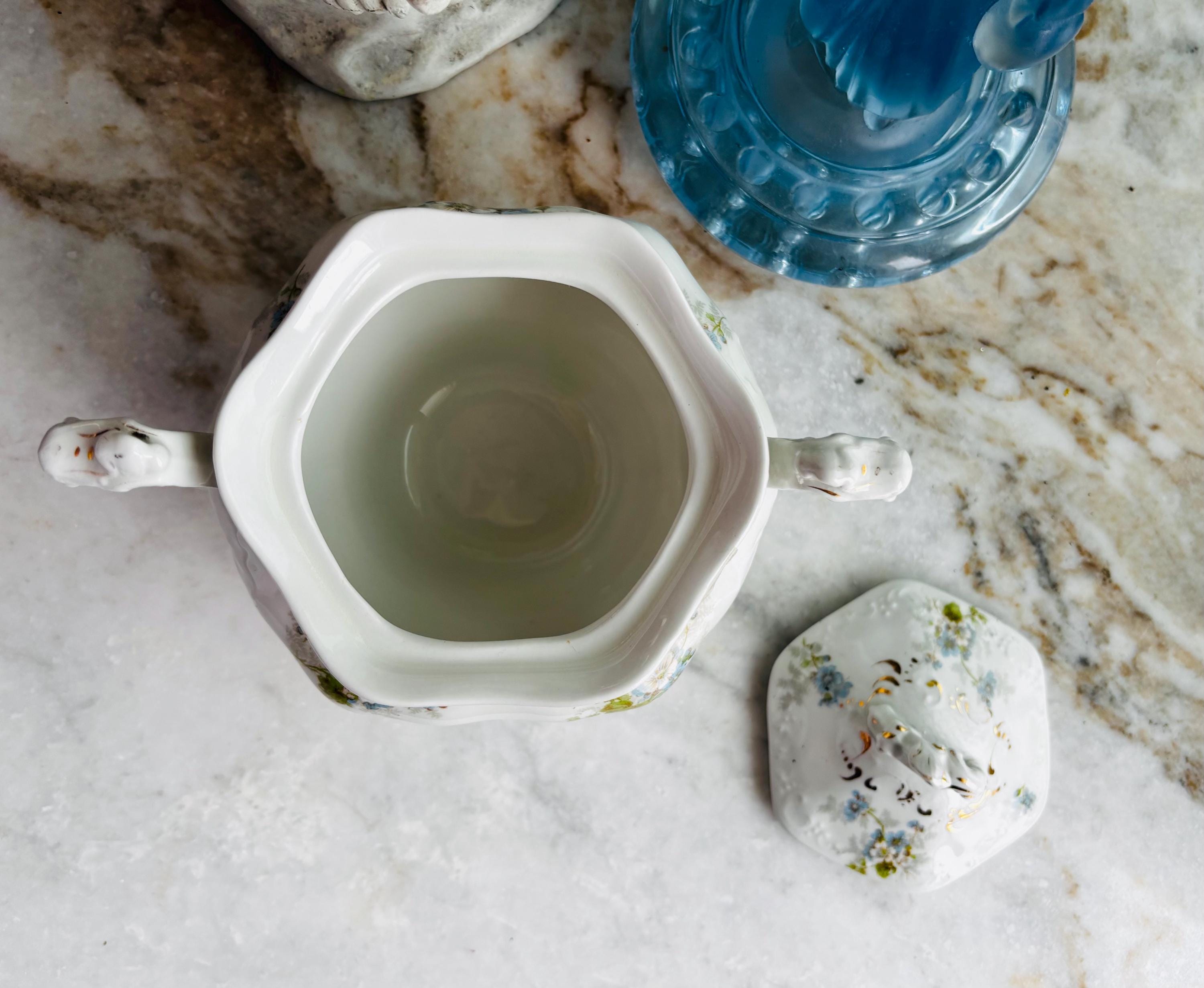 Circa 1920's, this highly ornate sugar bowl, has hand painted baby blue & white flowers, with green leaves trailing and rambling throughout. Highly embossed details of fish scales on lid and scrolling details everywhere!