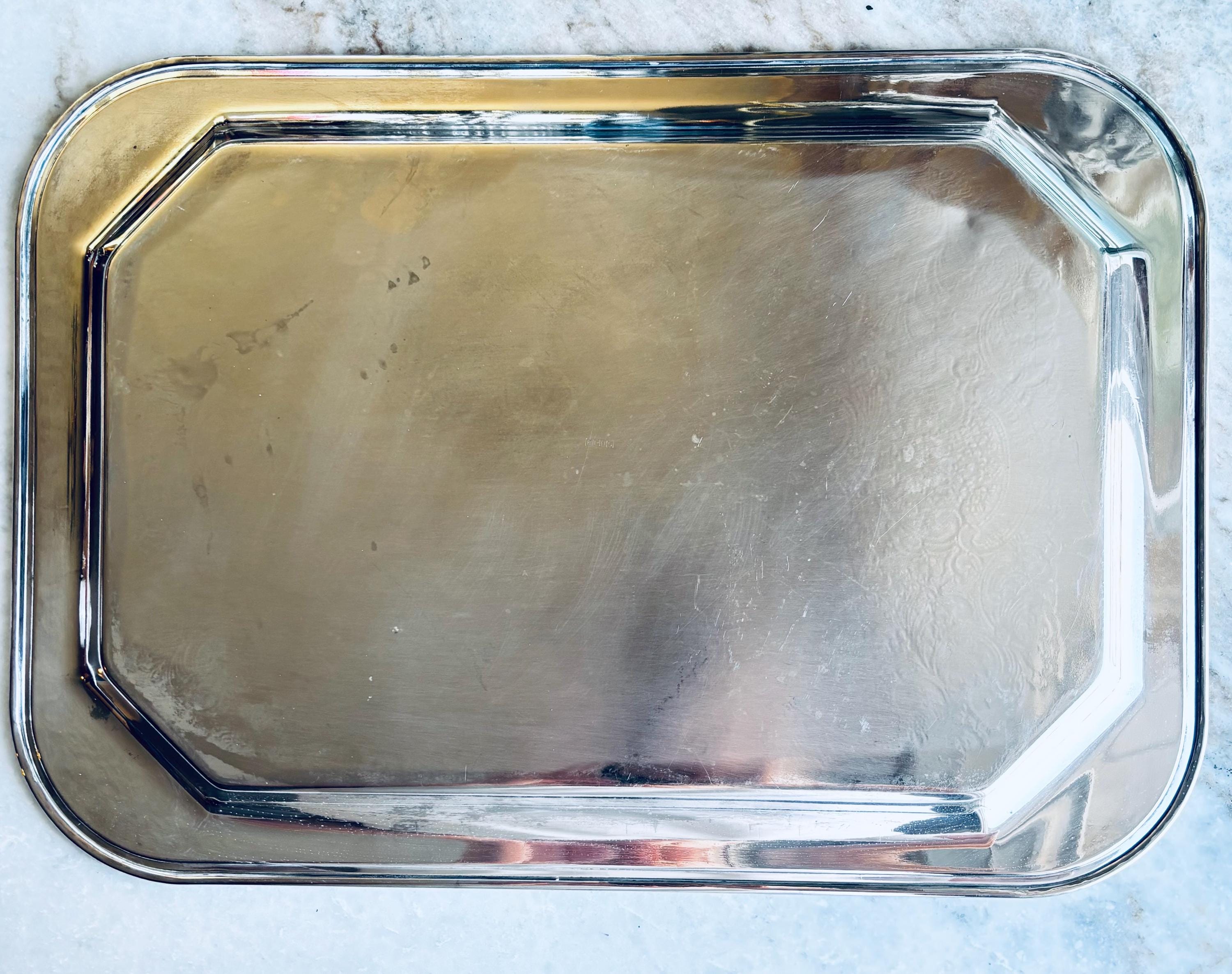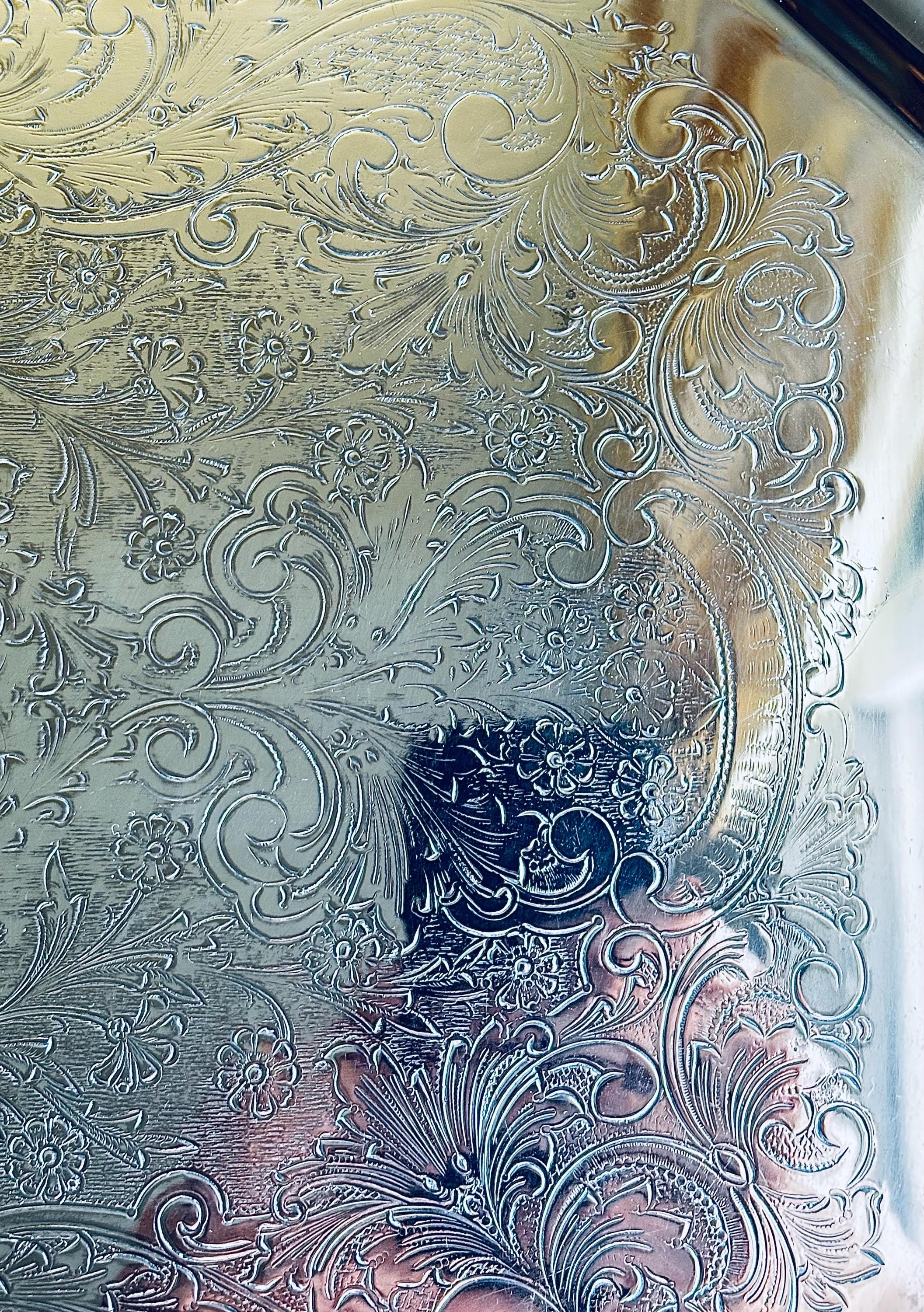Filled with etched ornate scrollwork throughout the surface, and rolled edges. Has a plain center for personalizing, if desired.