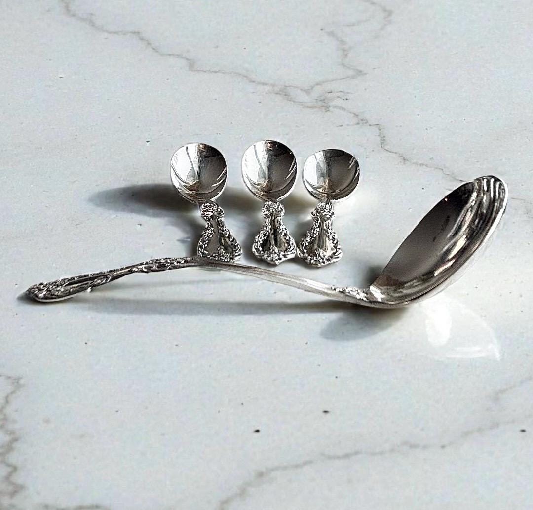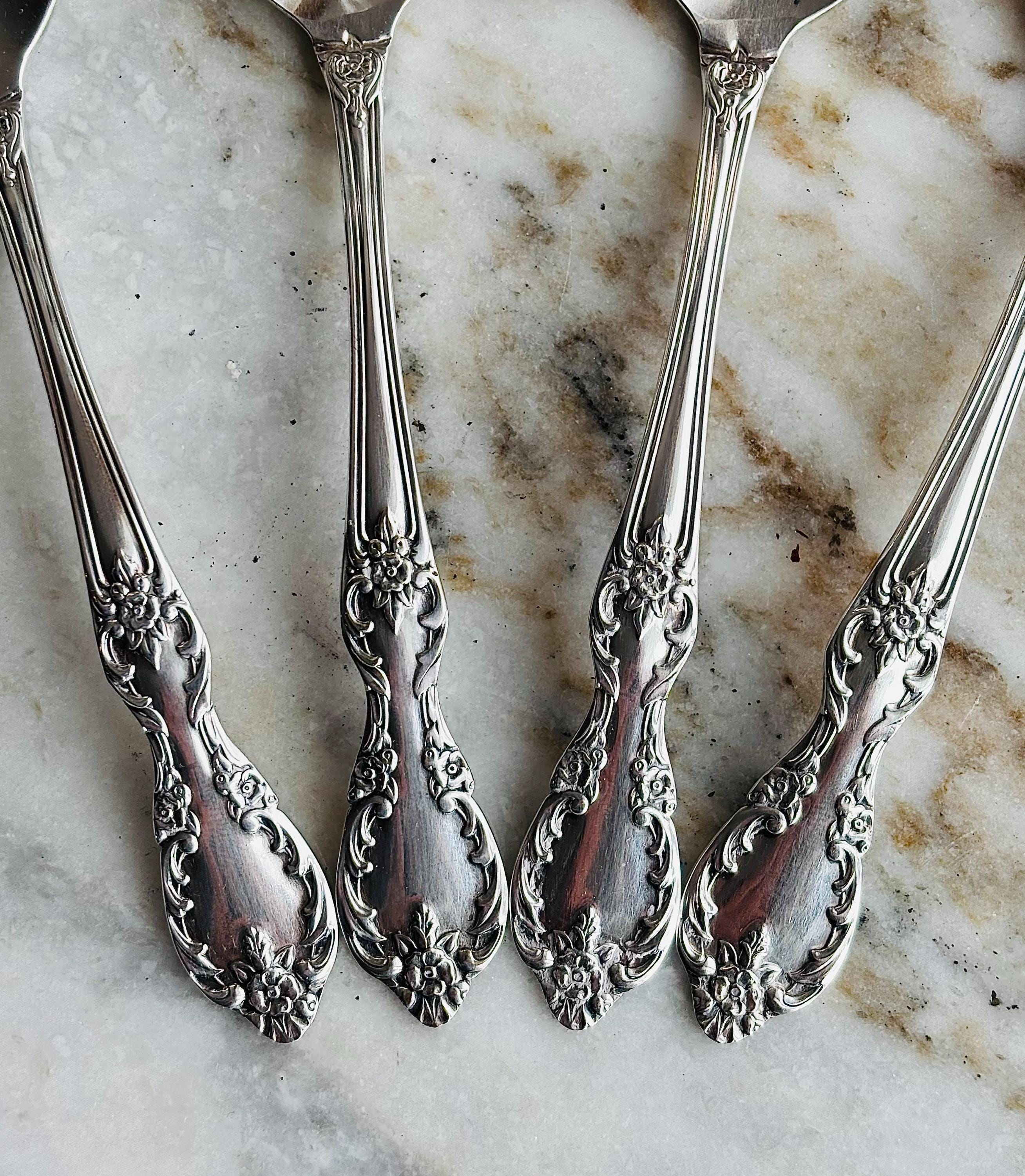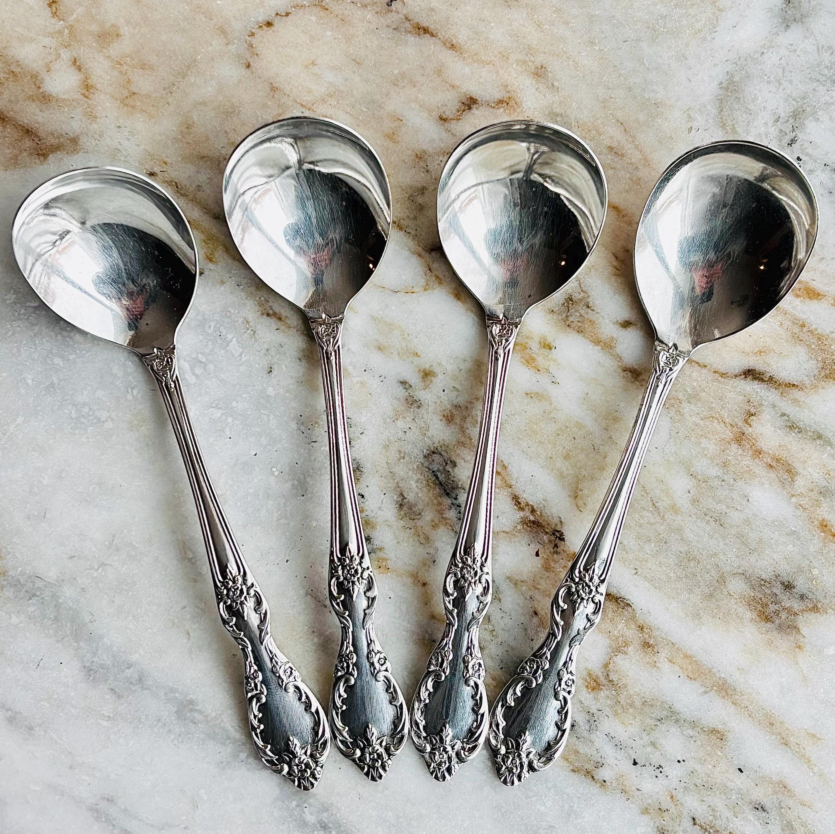 Magnificent vintage William Rogers "Grand Elegance" Sugar/Boullion/Gumbo spoons. This pristine set of 4 silver plated spoons, are in a gorgeous Baroque design, with the lovely rounded and raised bowl. Made of "Extra Plate", which consists of extra silver then the standard silver plate.