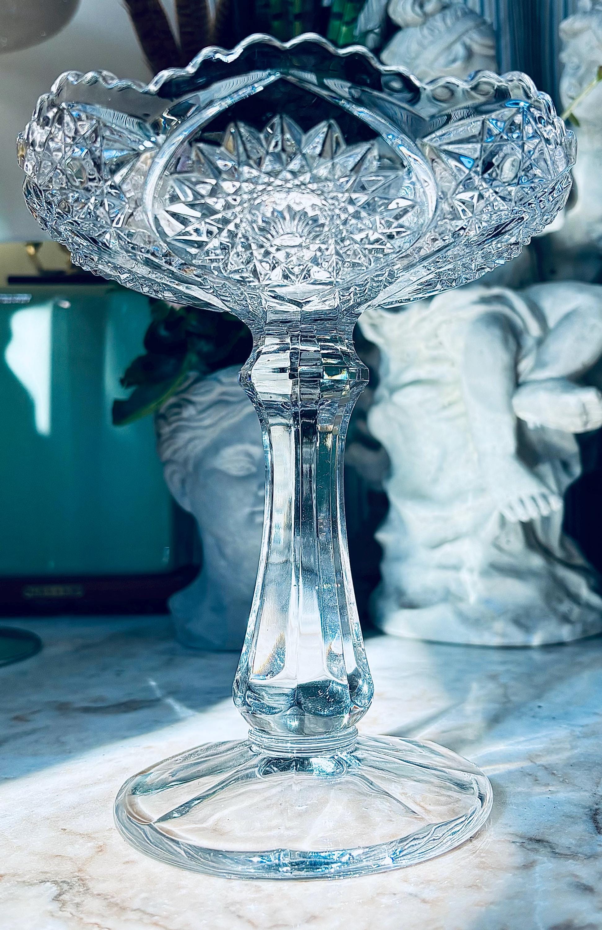 Exquisite antique EAPG Duncan & Miller crystal compote in “Homestead Clear”, pattern no. 63.