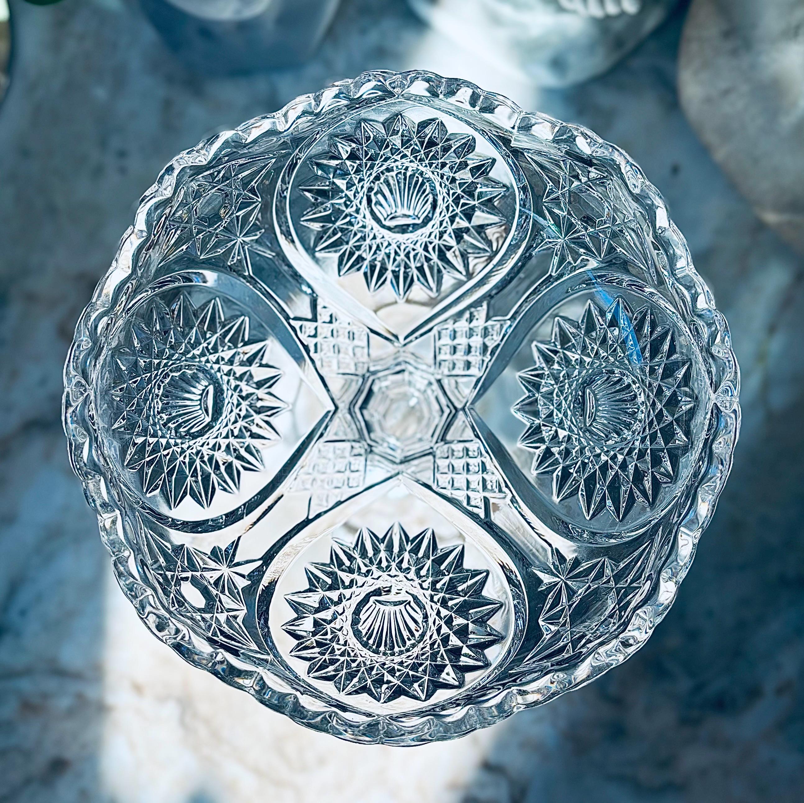 Circa 1900’s, she possesses a magnificent deep cut crystal “shell in star” design. Known for its elegant refraction to light, due to its sensational design throughout.